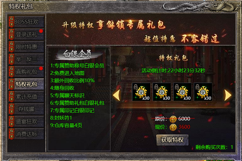 1.活动期间,玩家可在活动面板购买限购礼包,拥有对应的赞助特权,才能购买对应的礼包哦