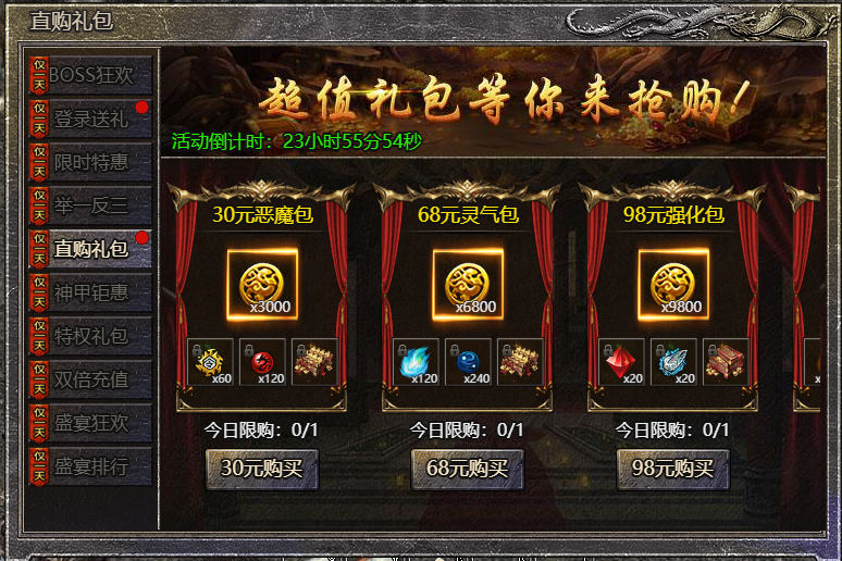 1.活动期间,玩家可在活动面板购买限购礼包,神剑特惠、神甲特惠、魔魂特惠、徽记特惠、经脉特惠、神阶特惠、荒古特惠