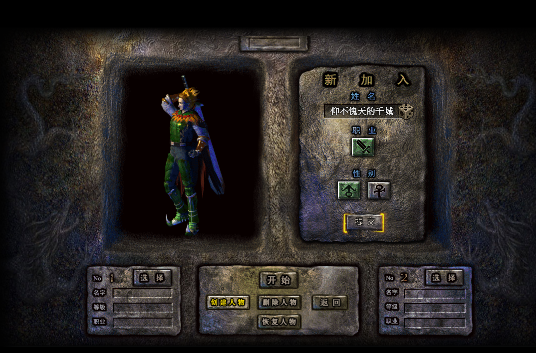 进入角色创建界面,随机选择或输入昵称。当昵称符合规范且未被他人注册时,才可以使用。选择一个性别,点击“提交”或者“开始”: