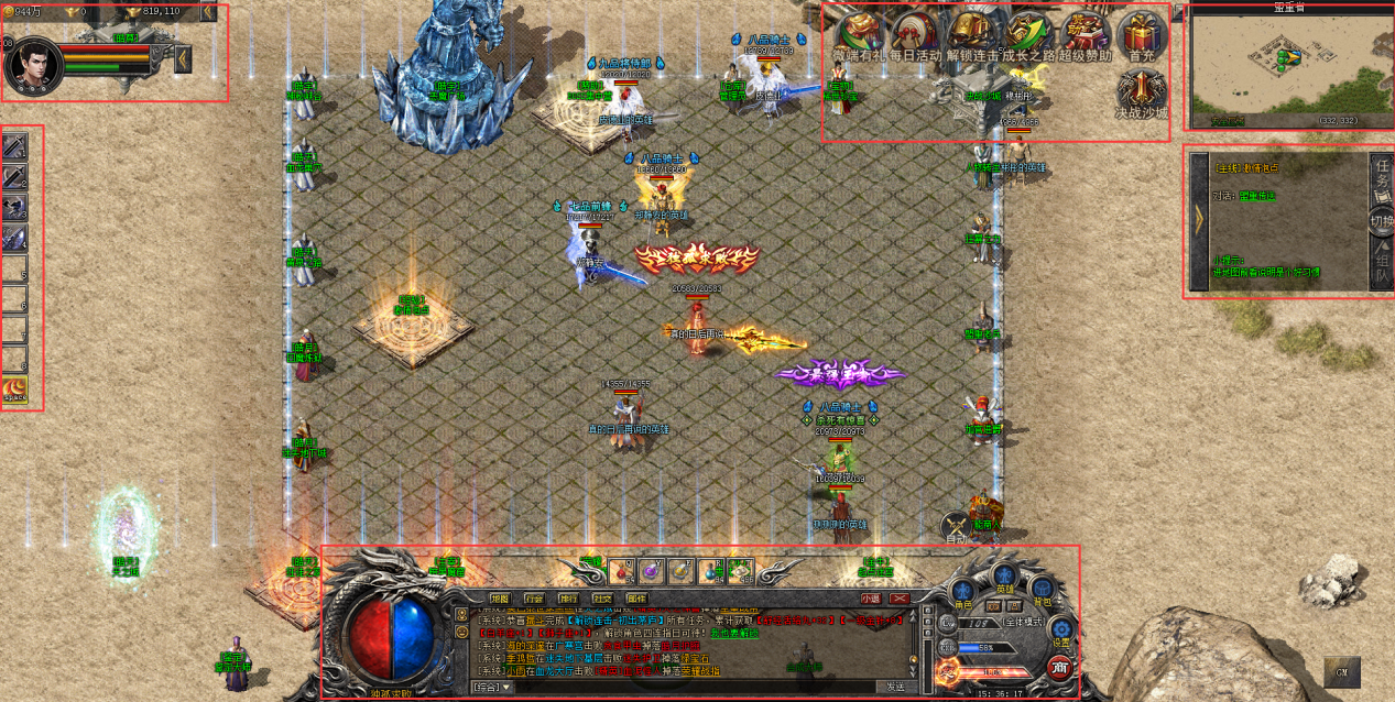 3.操作栏:包括主角状态、聊天功能、操作按钮。主角状态可以看到关于主角的信息,血量、魔法值、等级、经验条、合击怒气值、连击值等。聊天功能可选择各种频道进行文字和表情的交流。操作按钮,包括角色、英雄、背包、设置、商城、行会、地图、排行、社交等。