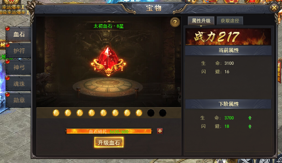 宝物一共有血石、护符、神弓、魂珠、勋章5个子系统,提升对应子系统等级可大幅提升角色属性。