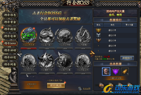 击杀行会BOSS可获得奖励,对BOSS的累计伤害值进行排名,根据排名获得排行奖励;