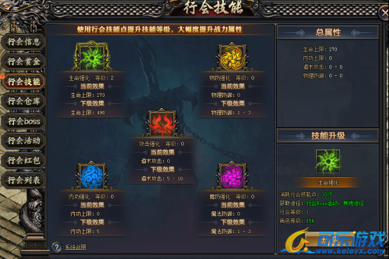 使用行会技能点可提升技能等级,大幅度提升战力属性,行会技能点可通过行会BOSS、行会赏金进行获取;