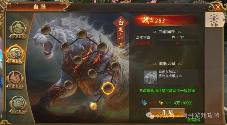 开天西游重回西游折扣包服大圣传奇角色达到280级开启血脉系统。血脉系统分为:青龙血脉,白虎血脉(2转),朱雀血脉(3转),玄武血脉(4转)可使用对应的血脉精血以及元宝对对应的血脉升星,获得大量的属性,不同血脉有不同的特殊属性。