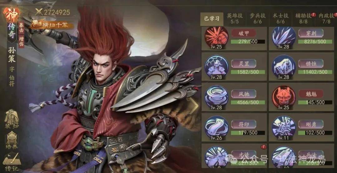 接着咱们说一说他的技能,因为他是步兵兵种将,所以还是远战减伤,近战靠兵种打输出。那么技能第一个选择激励,第二个铁壁,第三个天问,学习天问需要学智力或者需要带一些增加智力的装备,第四个技能选择觉醒技能关联的极焰,这是S1孙策的标配了。S2再学一个象阵,这个技能特别适合他,同时还有概率使对方混乱。