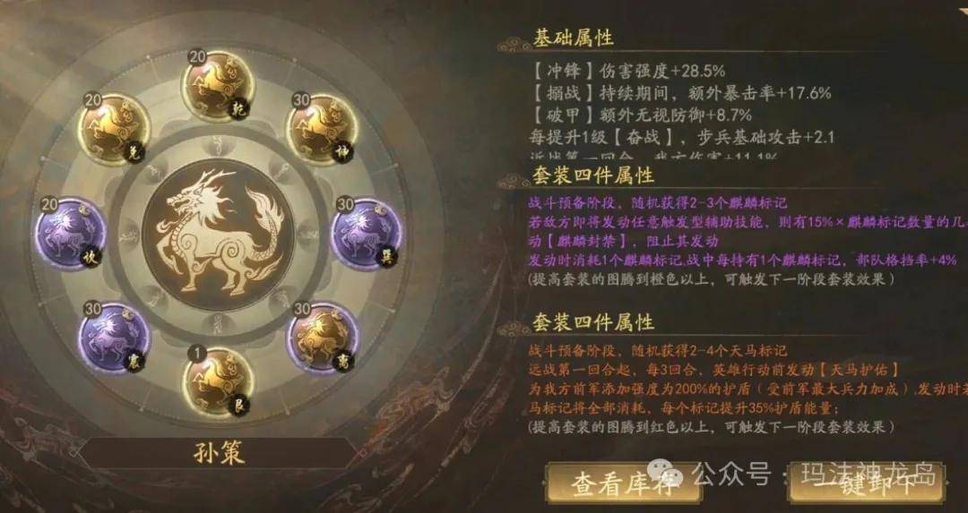 最后图腾,图腾也比较简单,4天马,搭配4麒麟/4雄狮/4夔牛/4鱿鱼都可以,也可以4天马搭配远战免伤,近战增伤的图腾。(图腾详细攻略下期分解)