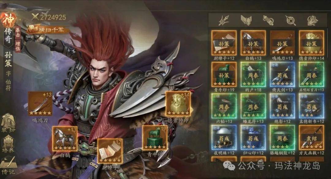 再讲讲装备,武器首选明红刀,也可以上三尖刀,坐骑选武侯车,典籍司马法,宝物选择香炉,这也是孙策的专属装备,将令用帅印,S1 孙策两个阶段,有帅印和神将可以跟赵云55开,这是S1极限了。