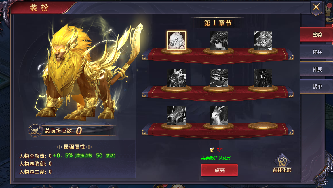 v 【类别】目前共4个,分别是坐骑、神兵、神翼、战甲,界面展示的第一章节的类目,完成第一章节所有典藏后下滑可开启第二章节;