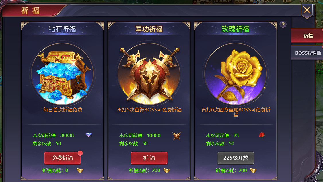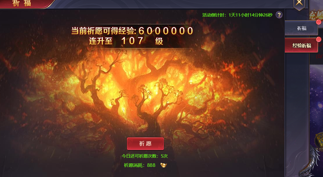Ø 每个经验祈福,消耗元宝可获得大量经验,经验随着祈福次数变大而变大