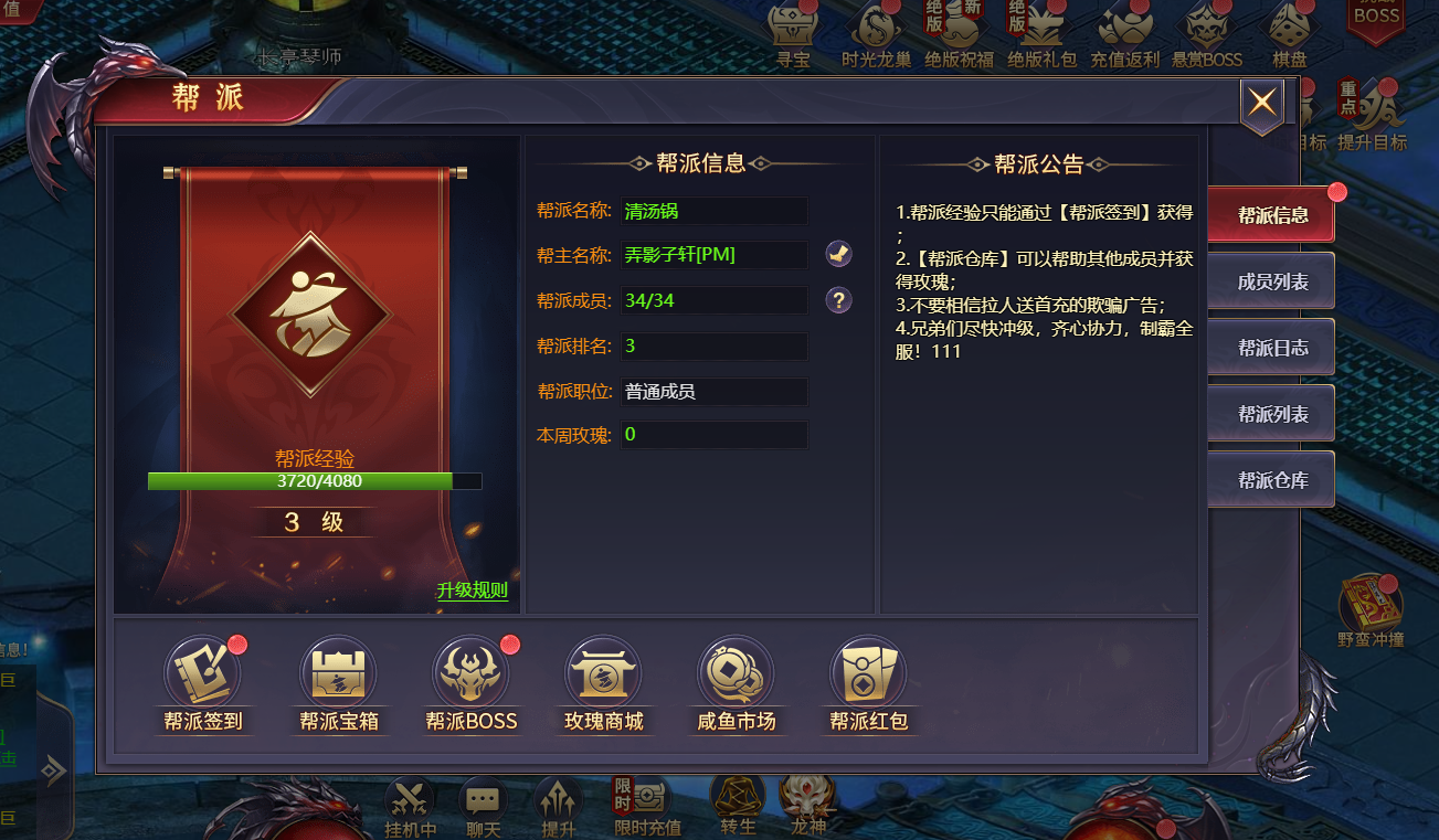 帮派BOSS:通过击败帮派BOSS获得奖励,可求助其他帮派成员一起挑战