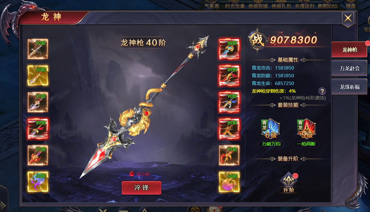 l 【龙神枪穿刺】提升龙神枪淬锋阶数,可在对应跨服玩法地图内刺破BOSS水盾,造成强力的最大生命值百分比伤害