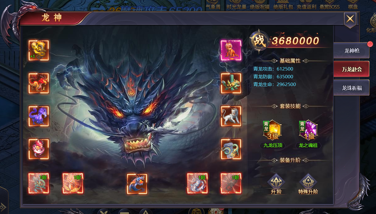 l 【祖龙装备】可通过运营活动获得,并消耗同部位的祖龙装备进行升阶,穿戴可极大提升人物属性