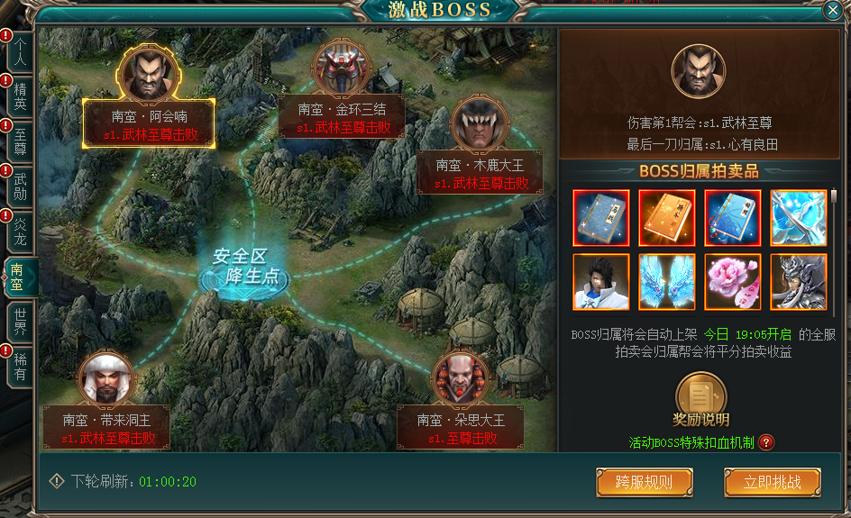 帮会成员对BOSS造成的总伤害第一则可获取BOSS掉落归属,BOSS掉落将在帮会篝火活动中拍卖,所得元宝均分给参与活动的帮会成员