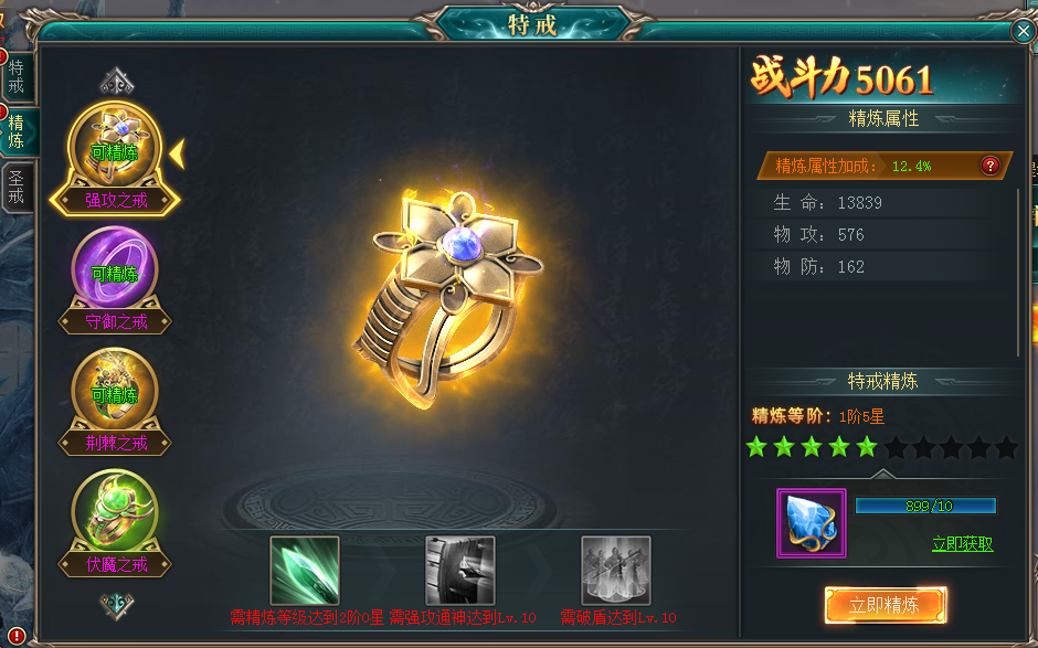 使用特戒精炼材料可提升特戒精炼等级,并激活特戒技能