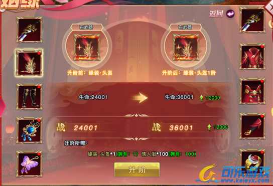 缘装可通过姻缘副本产出,获得缘装后消耗道具升阶,不同阶数的缘装消耗不同的材料升阶;