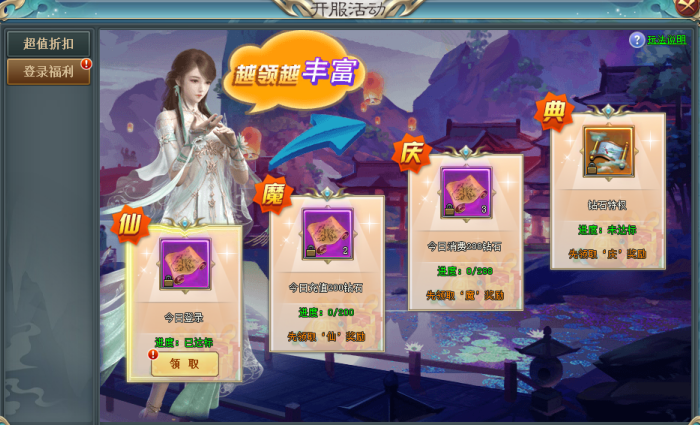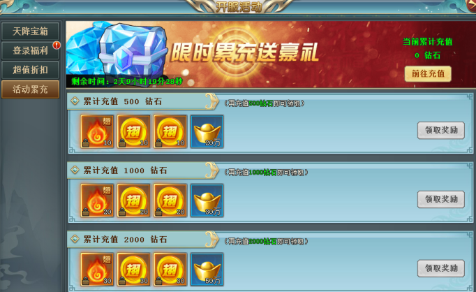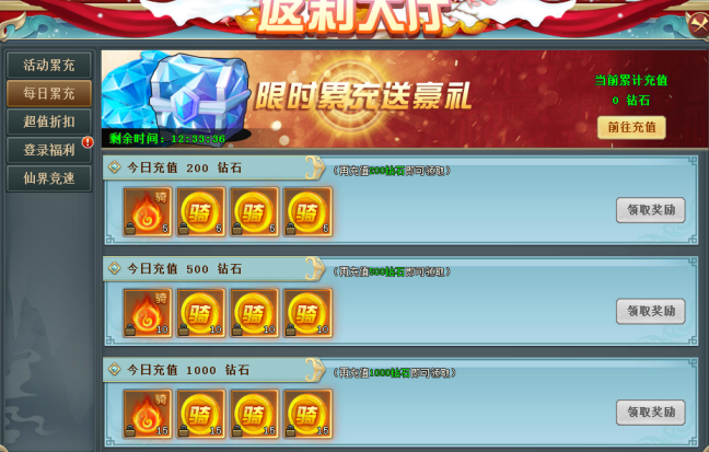 活动内容:每天充值指定金额钻石可领取丰厚奖励