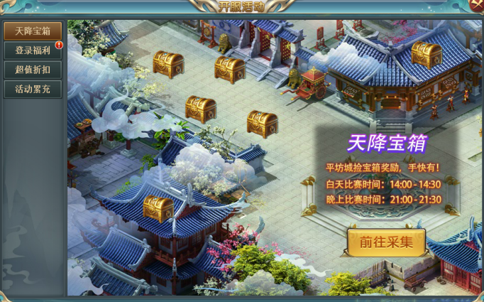活动内容:每天:14:00和21:00开启活动,活动开启后会刷新大量宝箱,采集宝箱可获得丰厚奖励