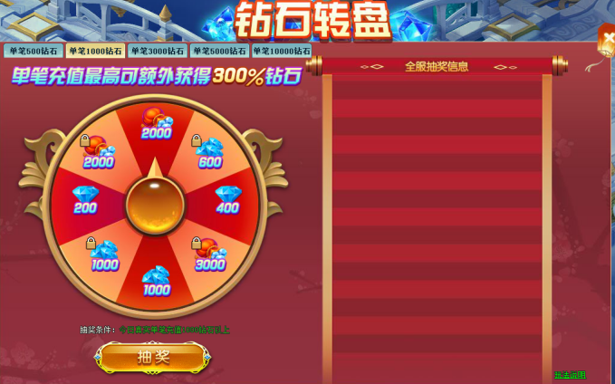 活动内容:单笔充值达到指定档次可抽取钻石奖励