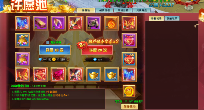 玩法1:消耗许愿币可进行许愿池抽奖,可获得大量珍稀道具