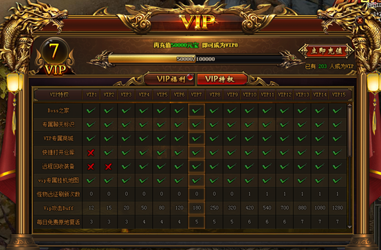 3. VIP系统分15个等级,累计充值一定额度激活相应VIP等级,VIP等级越高属性加成越高。