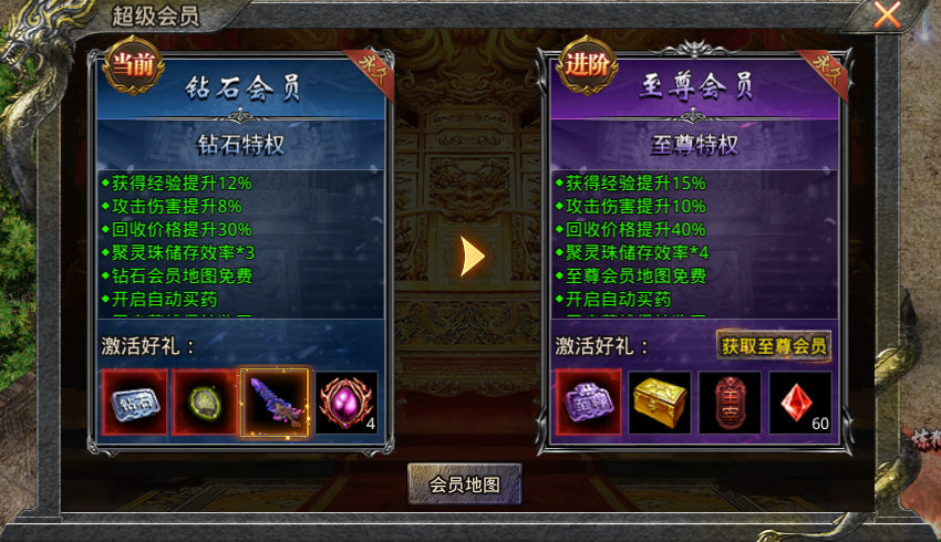 会员分七种:青铜会员、白银会员、黄金会员,钻石会员,至尊会员,荣耀会员,创世会员。每个会员都带有一定的属性加成,玩家可通过首充或商城荣誉购买获得青铜会员。超级会员不仅有丰厚的属性加成和专属称号,并享受免费进入会员专属地图等等特权
