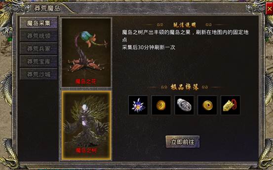 开服之后的第五天开启蛮荒魔岛地图,主界面右上或盟重省-蛮荒魔岛NPC进入,每天11:00后开放进入。玩家可以采集生物,击杀魔岛BOSS获得极品奖励