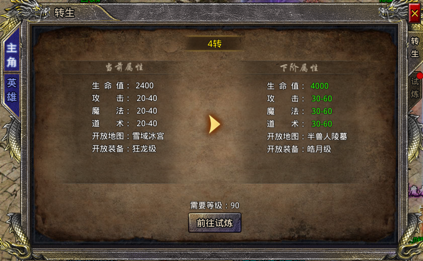 玩家在完成主线任务后可开启转生系统,通过点击转生按钮可进入转生界面: