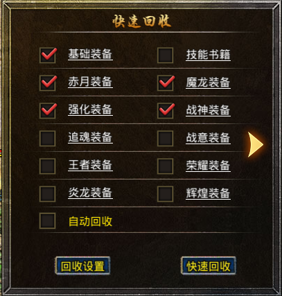 可以将游戏中被淘汰的装备可以用来回收,根据回收装备品质可获得传奇币或是元宝。回收装备获得的游戏货币能用于多类养成系统,提升自身战力。根据玩家的自身等级情况,可勾选不同品质的装备进行快速回收。