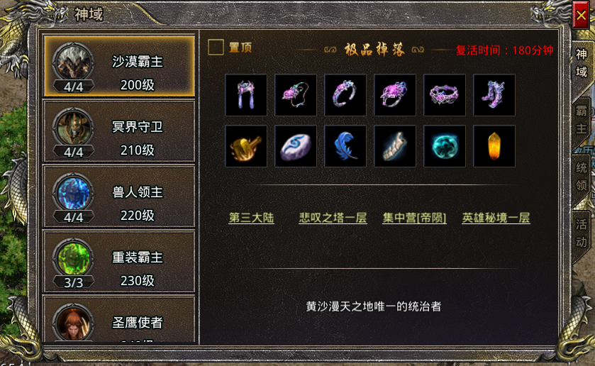 玩家每天可以通过主界面右上的霸主挑战按钮挑战BOSS。击杀后可掉落出极品装备,在首领BOSS功能中,玩家可以方便快捷的在野外地图寻找挑战各种首领BOSS和精英怪物,BOSS掉落获得高品质装备的玩家会通告全服玩家,让人羡慕不已。