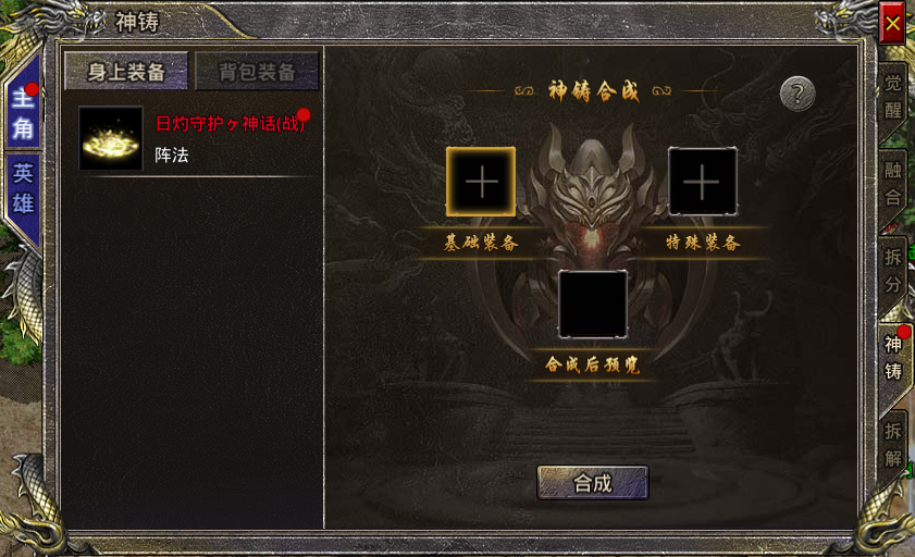 辉煌以上装备可与对应部位神铸装备神铸,神铸后基础装备保留原有属性和强化,并获得特殊装备的额外套装