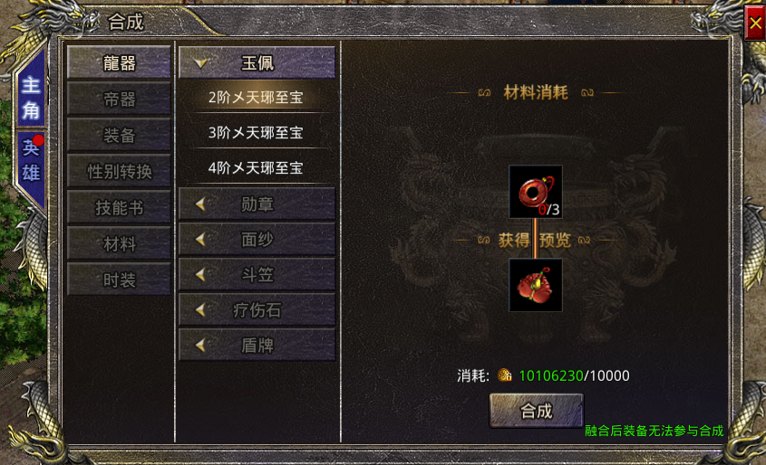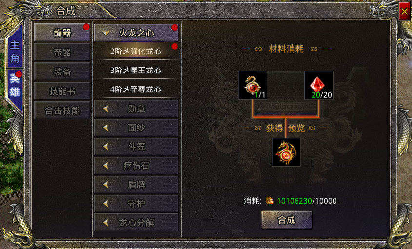龍器属于特殊的装备,类别有:斗笠,疗伤石、面纱、盾牌、玉佩和勋章;英雄有火龙之心。合成界面能找到合成,玩家需要参与限时活动获得材料进行锻造合成