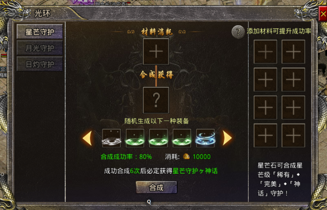 合成守护消耗对应的材料石,有几率获得随机品质、随机职业的守护,星芒石为最基础的守护,只需要1个星芒石就有80%的几率成功,基本上都不会失败,合成月光守护需要月光石,加若干月光残片(1-8),添加8个残片后,将百分百成功,合成日灼守护需要日灼石加若干日灼残片,和月光守护同理,(守护成功合成8次后必定获得神话品质的守护,三种守护不会相互叠加成功次数)