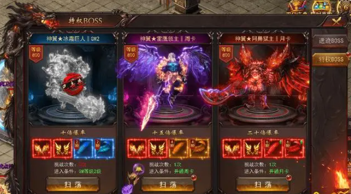不同等级的Boss: 特权Boss地图根据等级划分,每个等级的Boss具有不同的难度和奖励,高等级Boss提供更优厚的掉落。