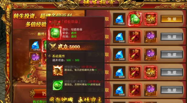 7. 转生助力礼包: 在精彩活动中的转生助力礼包中,玩家可以获取包含大量经验的超级经验箱,同时有机会获得勋章。