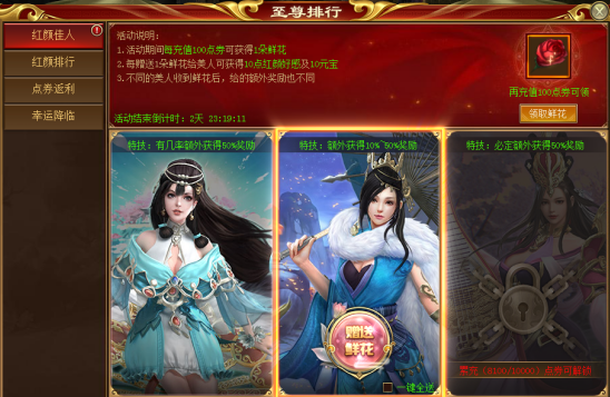 赠送给美人甄姬有几率额外获得10%~50%奖励,需累充1000点券解锁该美人