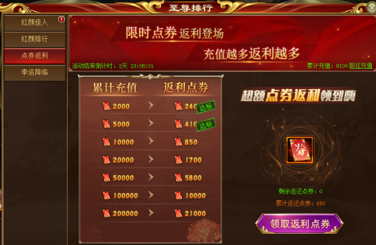 活动期间累计充值满5000点券可领取:410点券(累计返利650点券)