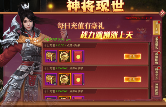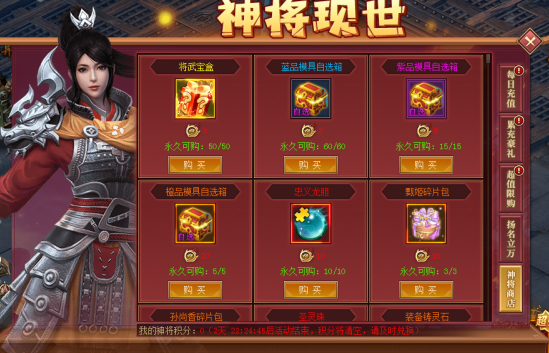 活动时间4月15日~17日,可消耗活动期间充值获得的神将积分兑换道具