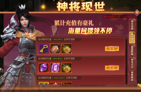 累计充值充值10000元可领取:红品6星装备自选箱*1、无双信物*3、100精力瓶*5、神将积分*100
