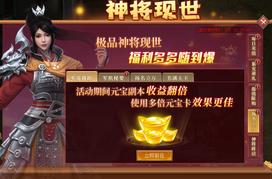 活动时间4月15日~17日,期间元宝副本收益翻倍,与多倍元宝卡完美叠加