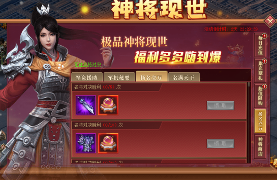 名将对决胜利5次可领取:紫品武将武器*1、气血丹(大)*1