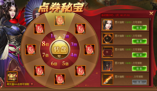 点券秘宝开启后,会随机获得点券并随机点券倍数,最终获取点券为点券金额*倍数,例如小明充值50元,领取点券秘宝后开启,获得68点券*8倍,最终获得544点券。