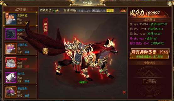 坐骑洗炼:满阶坐骑可通过换血丹进行洗炼,大幅提升坐骑属性并可更换坐骑外观特效;