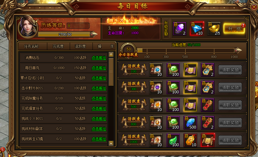 玩家通过完成每日目标获得活跃度,活跃度可提升历练等级,提升历练等级可增加人物属性和战斗力,还可获得升级奖励,历练等级越高所需要的活跃度越多,活跃度进度达标后还可获得专属活跃度奖励