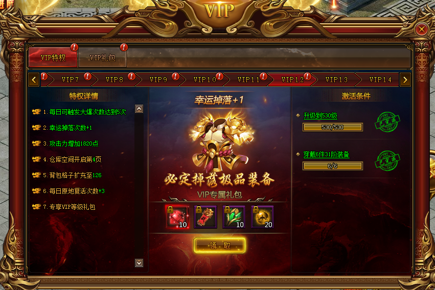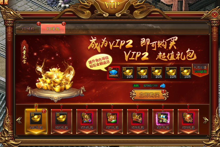 提升到对应VIP等级满足条件即可购买想要礼包,礼包消耗将全部返还