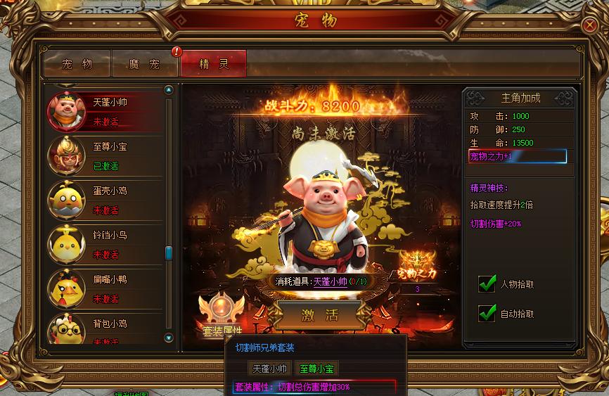 宠物界面提供火麒麟和水麒麟装备镶嵌,激活可提高大量基础属性,并获得麒麟特殊属性