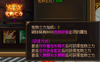 宠物之力:提升宠物之力,可破除宠物之力护盾,这是挑战宠物·稀有boss的基本条件