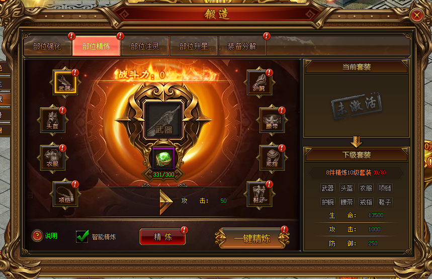 可通过消耗精炼石提升八个职业装备部位的精炼属性加成,并可获得精炼套装属性