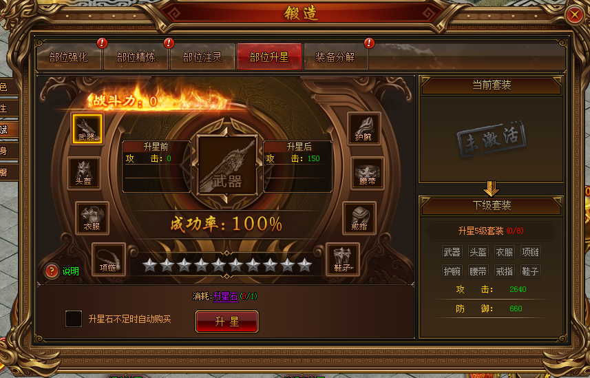 可通过消耗升星石提升八个职业装备部位的升星属性加成,并可获得升星套装属性