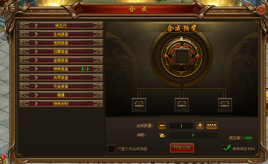 (10)合成特殊装备:虎符、官印、圣盾、圣器、法器装备合成方式为二合一;噬魂装备三合一;消耗对应数量低1阶装备合成高1阶