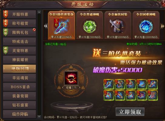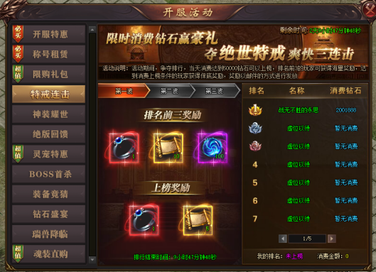 活动说明:活动期间,每天消费钻石达到50000钻石,在当天活动结束时即可获得麻痹、复活、护身特戒及稀有材料奖励!